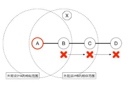 ☞ 如果外观设计B因为公开的公知外观设计X而被驳回,那么外观设计C也会因为外观设计B的销售而被驳回,因为外观设计C不能与被驳回的外观设计B关联,因此不适用公知外观设计例外。然后,外观设计D也会因为外观设计C的销售被驳回,因为外观设计D不能与被驳回的外观设计C关联,因此同样不适用公知外观设计例外。