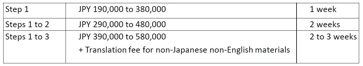 Our fees are calculated on an hourly-rate basis, which ranges from JPY 25,000 to 50,000 per hour. The below table shows our typical fees and time for the above Steps 1 to 3 for a single patent and a product.