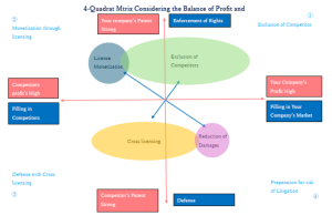 A four-quadrant matrix considering both profit balance and patent strength balance, used to map filing purposes.