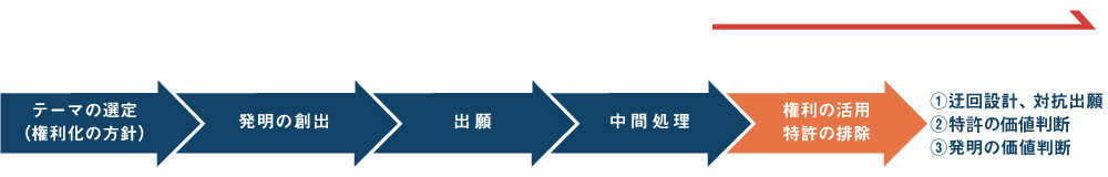 そこで、今後は今まで蓄積したノウハウを出願後の段階においても提供し、プロセスの全ての段階において、発明の展開力を発揮しお客様を支援してまいりたいと考えます。