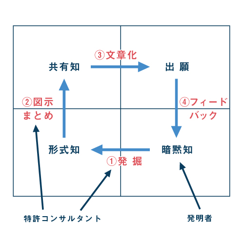 ブレインストーミングと特許明細書の作成により、暗黙知であったコンセプトが具体化されて全メンバーに共有されます。その後、次回のブレインストーミングを意識することにより、メンバーの間に新たな暗黙知が形成されます。ブレインストーミングから出願までを繰り返すことにより、新規事業のビジョンが具体化されます。