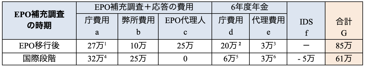 EPO補充調査を国際段階で受けると、欧州代理人を使わずに応答書面を作成してEPO移行時に提出できます。欧州代理人と、この提出費用を無料(c)と合意しておくことで合計費用が下がります(a,b,c)。またEPO移行後に補充調査が行われないので権利化が約1年早まり,EPOの出願維持年金が最後の1年(概ね6年度)分だけ下がります(d,e)。更に、米国出願前に文献を発見できるので米国IDSも1回減り(f)、合計費用が20万円程度も下がります。