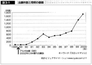 ここでは、日本全体におけるパチスロに関連する特許の出願件数を折れ線グラフで示している。矢印で示した一九八八年が、この裁判の対象の特許が出願された 時期である。判決が出たのは二〇〇二年であるが、それよりも十四年も前に特許が出願されているのである。