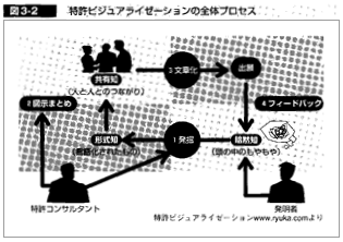 特許ビジュアライゼーションでは、まず複数の発明者をチームにしてテーマを決め、ディスカッション方式でアイディアを出し合う。対話を進めて研究課題を絞 り込む。この過程で、新たな発明を創出することが多々ある。