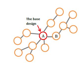 2. 유사하지 않은 디자인 A, B를 출원하는 경우, 중간적 디자인C를 출원함으로서 모든 디자인을 연관시키는 방법