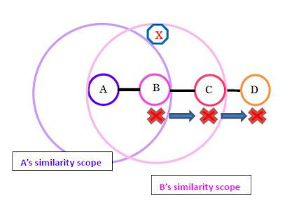 A와 B가 C에 의하여 연관된 그룹에 속한다면, A와 B 양쪽에 예외가 적용되기 때문에 X를 등록할 수 있습니다. 그러나, A와 B를 출원하면 더 이상 C를 등록할 수 없습니다.
