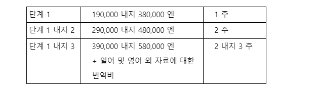 당소의 수수료는, 보통 시간당 25,000 내지 50,000 엔의 범위에서, 시간당 요금에 근거하여 산정된다. 하나의 특허 및 하나의 제품에 있어서 위 단계 1 내지 3에 대한 통상적인 수수료 및 작업 기간은 아래와 같다.